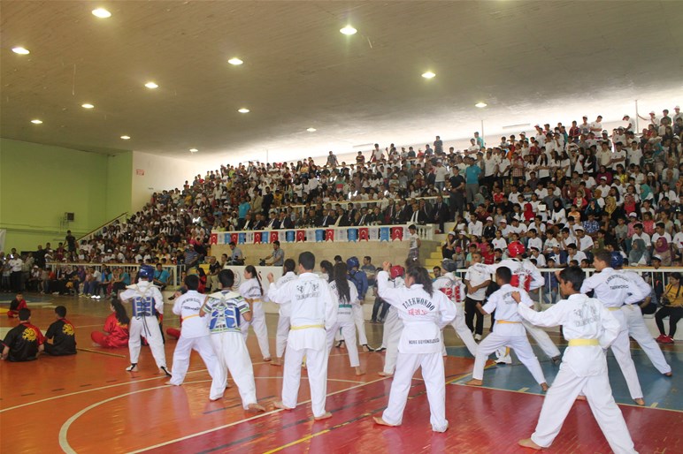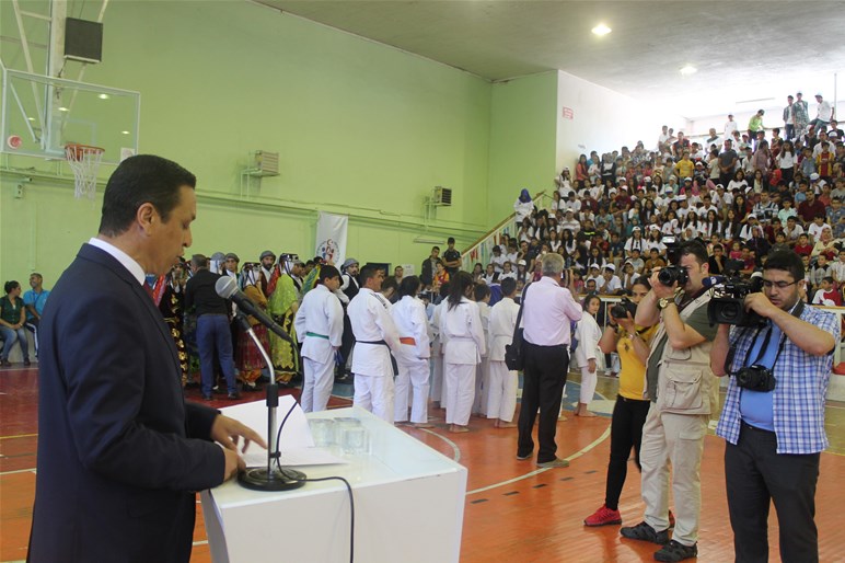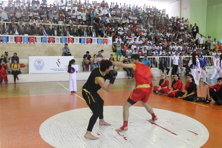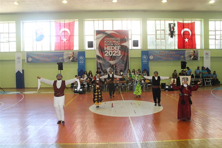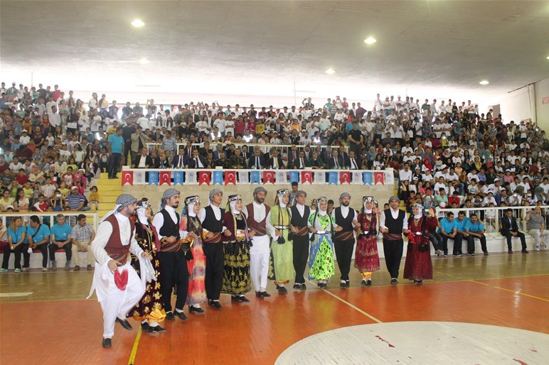 Mardin Atatürk Spor Salonunda düzenlenen tören öğrencilerin şiir okuması, müzik dinletisi, halk oyunları, wushu ve judo takımlarının gösterileri ile devam etti.